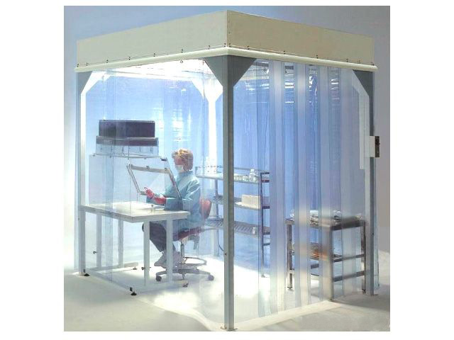 Soft wall cleanrooms have clear vinyl curtains that are 40 ml thick or they can be fitted with soft vinyl strips that alternate between clear and frosted. The units have a 3M proprietary dual lock system for curtain attachment. The standard ceiling height is 8 feet and has vinyl rock ceiling times. The latch connection system lets you disconnect and reconnect them in a variety of configurations.