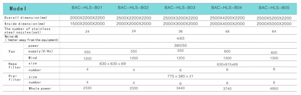The use of intelligent flat door, can automatically sense the door, can control the door, can open the door. A variety of door opening methods are available, smart and convenient. Significant improvement in the efficiency of the passage of goodsAdopt the filtering system of primary level and advanced level, Efficiency is above 99.99%,Equipped with large air volume and low noise fan to ensure the wind speed at the outlet is above 26m/s.